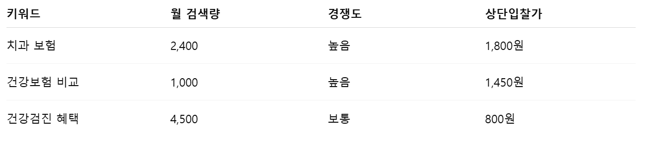 → 이 중 **‘치과 보험’**과 **‘건강보험 비교’**가 CPC 기준에서 수익형 블로그에 유리