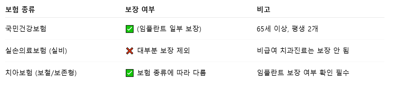 - 임플란트 1개당 보장금액: 보통 30만~100만 원 수준