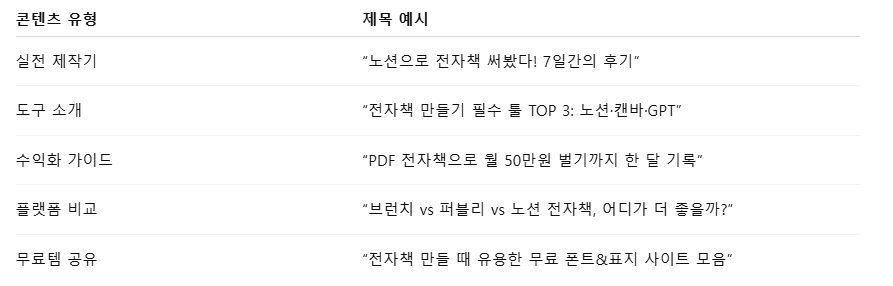 이 흐름에 올라타 전자책 관련 트렌드/제작기/도구 리뷰 콘텐츠를 작성해 보세요.