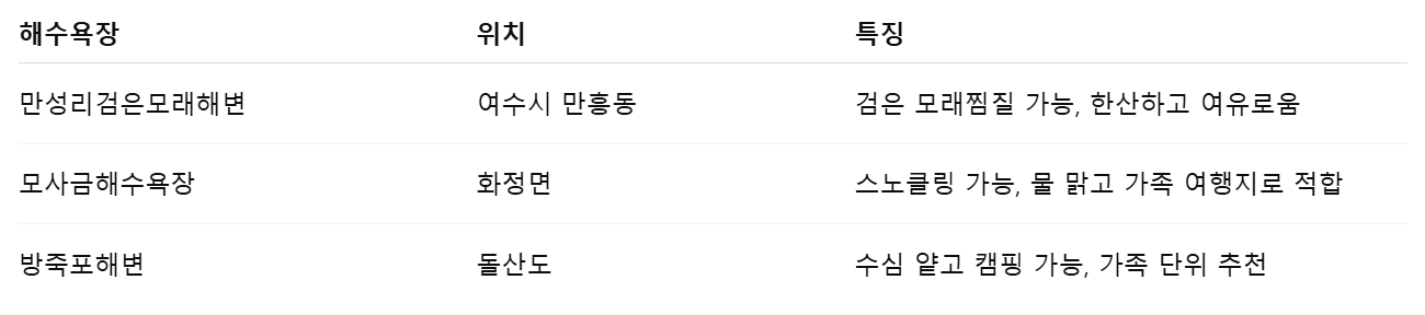 - 해수욕장 대부분 샤워장, 탈의실 구비 (소액 유료)