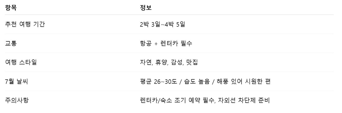 - 렌터카 사전 예약 필수! (늦으면 가격 폭등 + 차 없음)