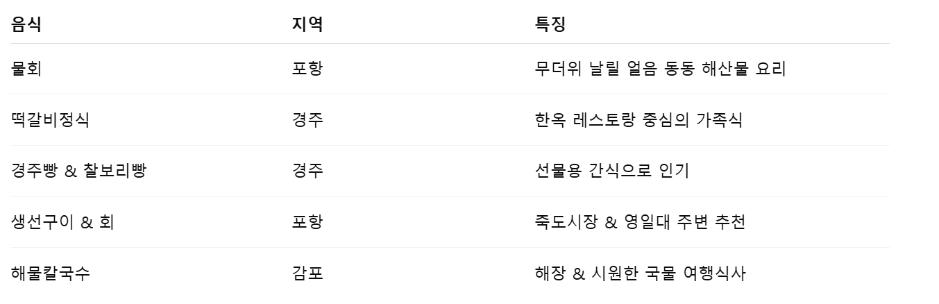 - 죽도시장: 물회, 과메기, 생선구이 등 포항 대표 먹거리 총집합
