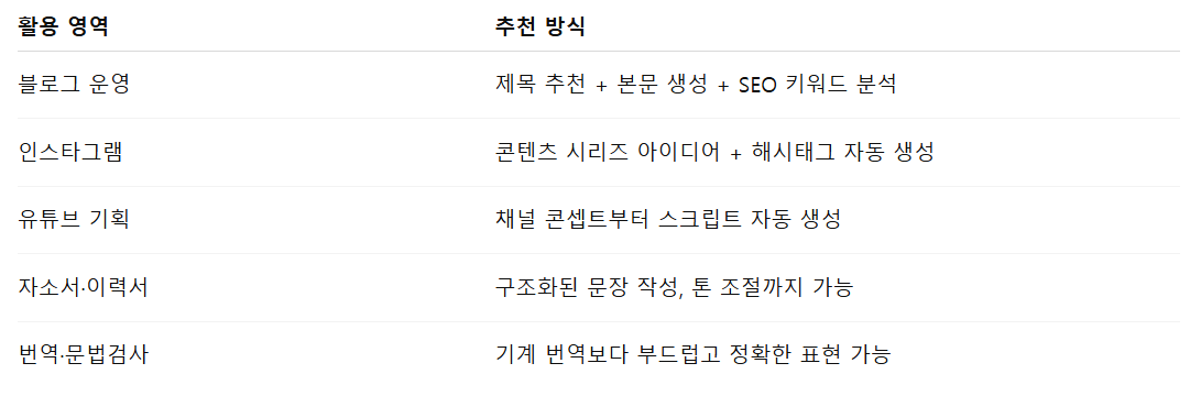 - 형식 지정: “표로 정리해줘”, “목차 포함해서 작성해줘”