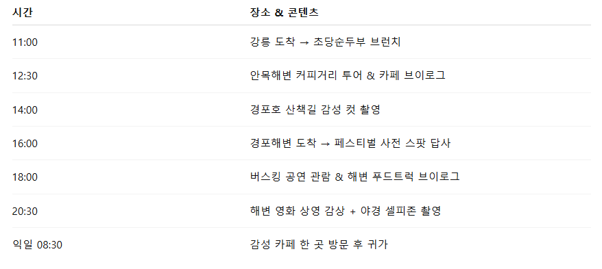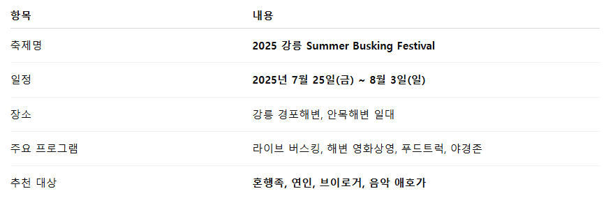 - 📱 추천 해시태그: #강릉해변버스킹 #감성여행 #혼자여행