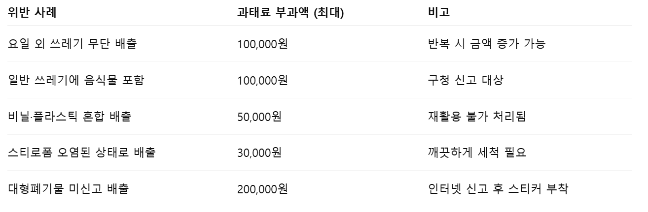 - ✔️ 배출 요일 외에 무단 투기하면 최대 100만원 과태료
