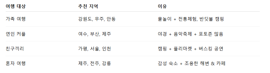 여행지를 고민 중이라면, 위의 일정표와 지역 추천을 참고해서 가장 나답게 즐길 수 있는 여름 여행을 계획해 보세요.