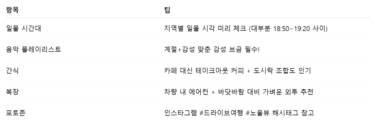 - 추천 포인트: 해질녘 + 야경 조합 / 드라이브+야시장+포차까지 연계 가능
