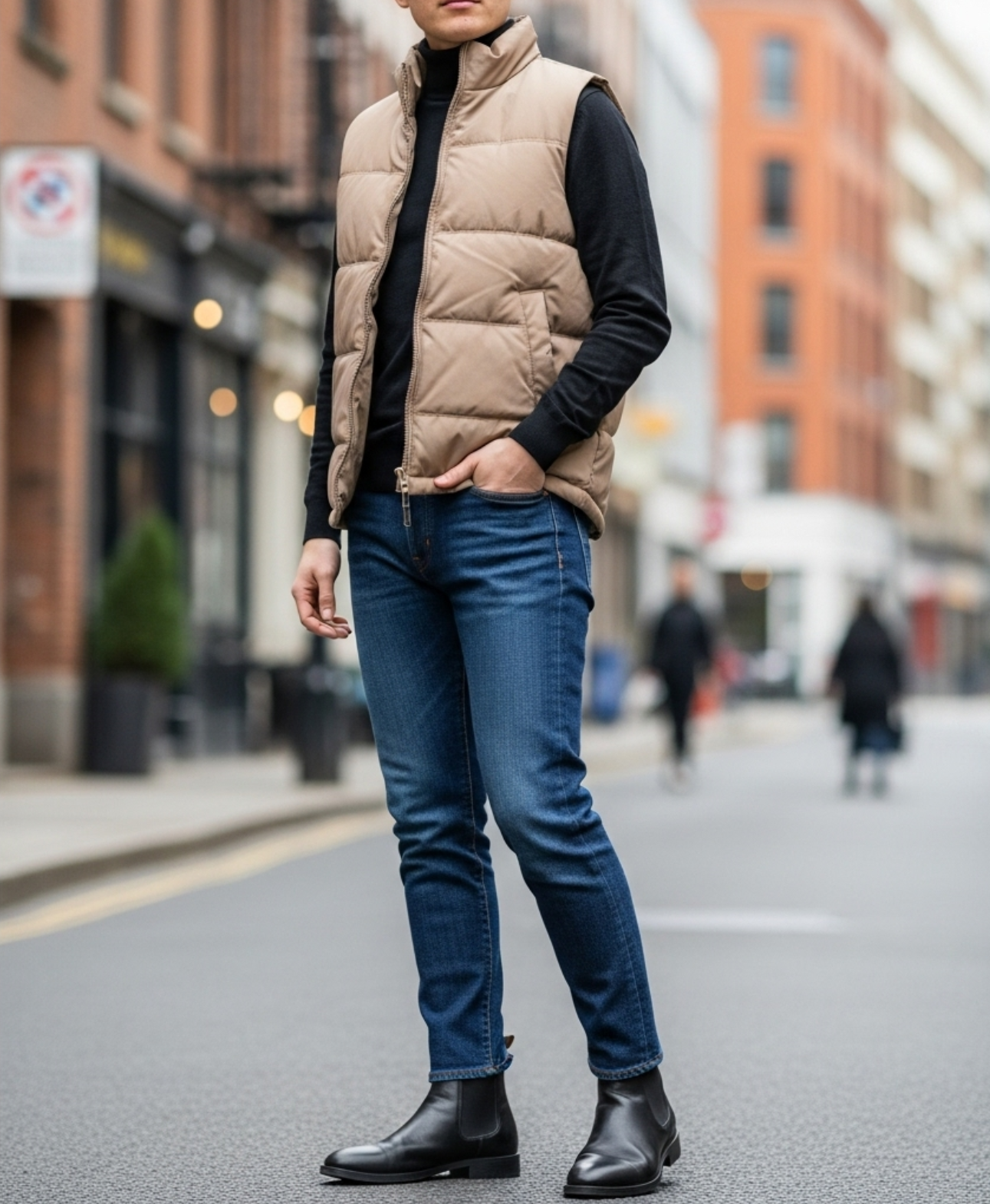 패딩베스트(베이지) + 터틀넥(블랙) + 청바지(인디고) + 첼시부츠(블랙)