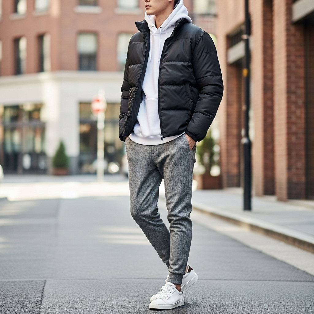 숏패딩(블랙) + 후드티(화이트) + 조거팬츠(그레이) + 운동화(화이트)