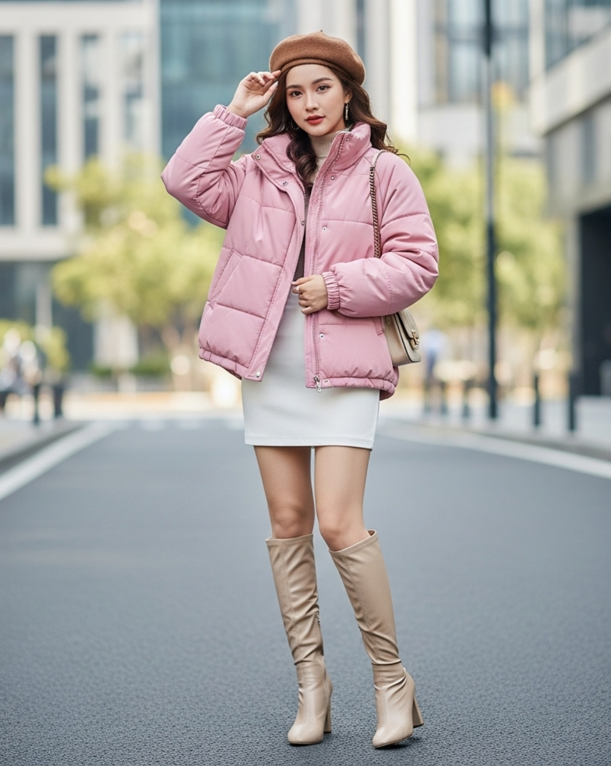 숏패딩(핑크) + 니트원피스(화이트) + 롱부츠(베이지) + 베레모(브라운)