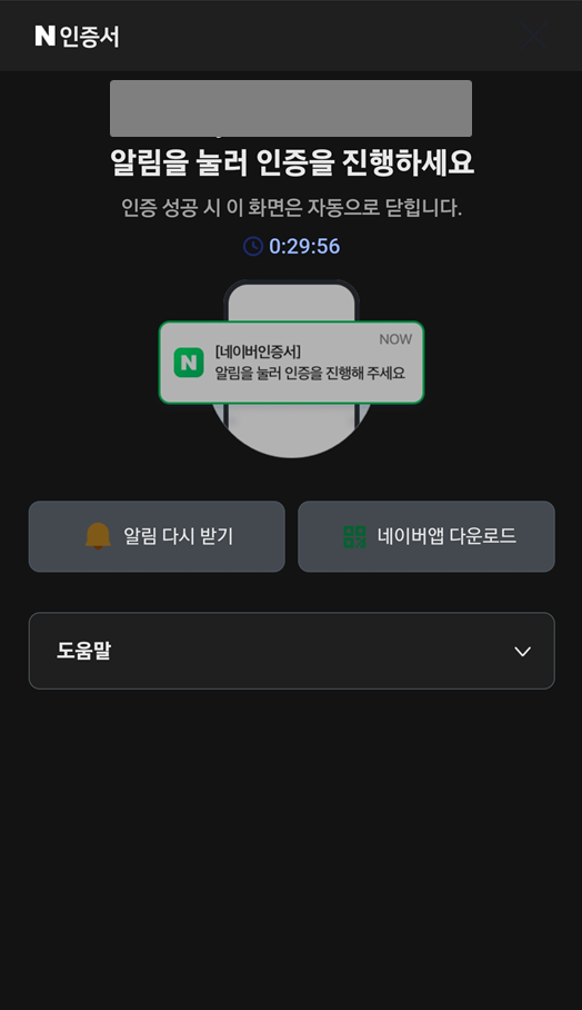 인증받을 핸드폰에서 네이버인증서를 통한 인증을 진행합니다.