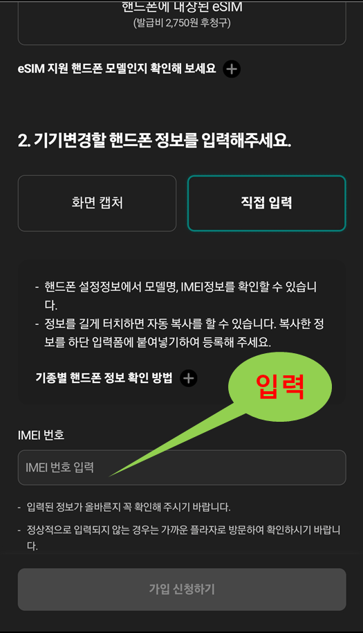 여기서 입력정보는 요고 요금제도를 사용할 핸드폰에서