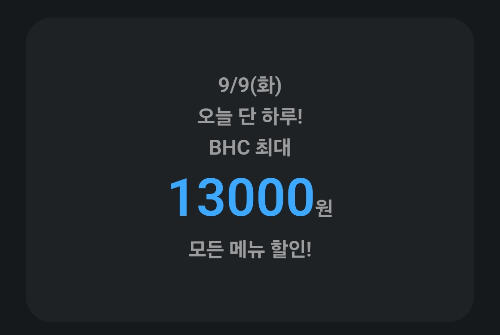퀴즈) 9/9(화) 오늘 단 하루! BHC 최대 OOOOO원 모든 메뉴 할인!