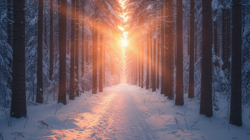 눈이 쌓인 나무줄기 사이로 빛이 새어 나올 때,
