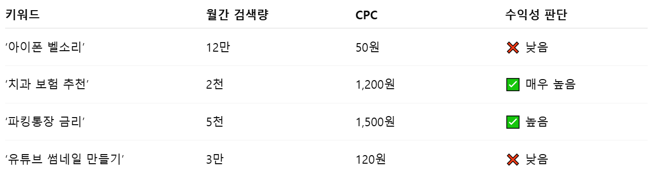 물론 방문자는 중요합니다. 하지만 **클릭당 수익(CPC)**이 낮은 키워드로 아무리 많은 유입을 만들어도